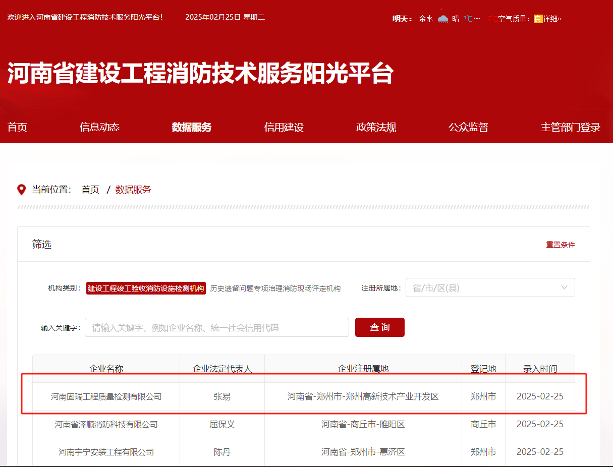 熱烈祝賀河南固瑞工程質(zhì)量檢測有限公司入冊河南省建設(shè)工程消防技術(shù)服務(wù)陽光平臺!!!
